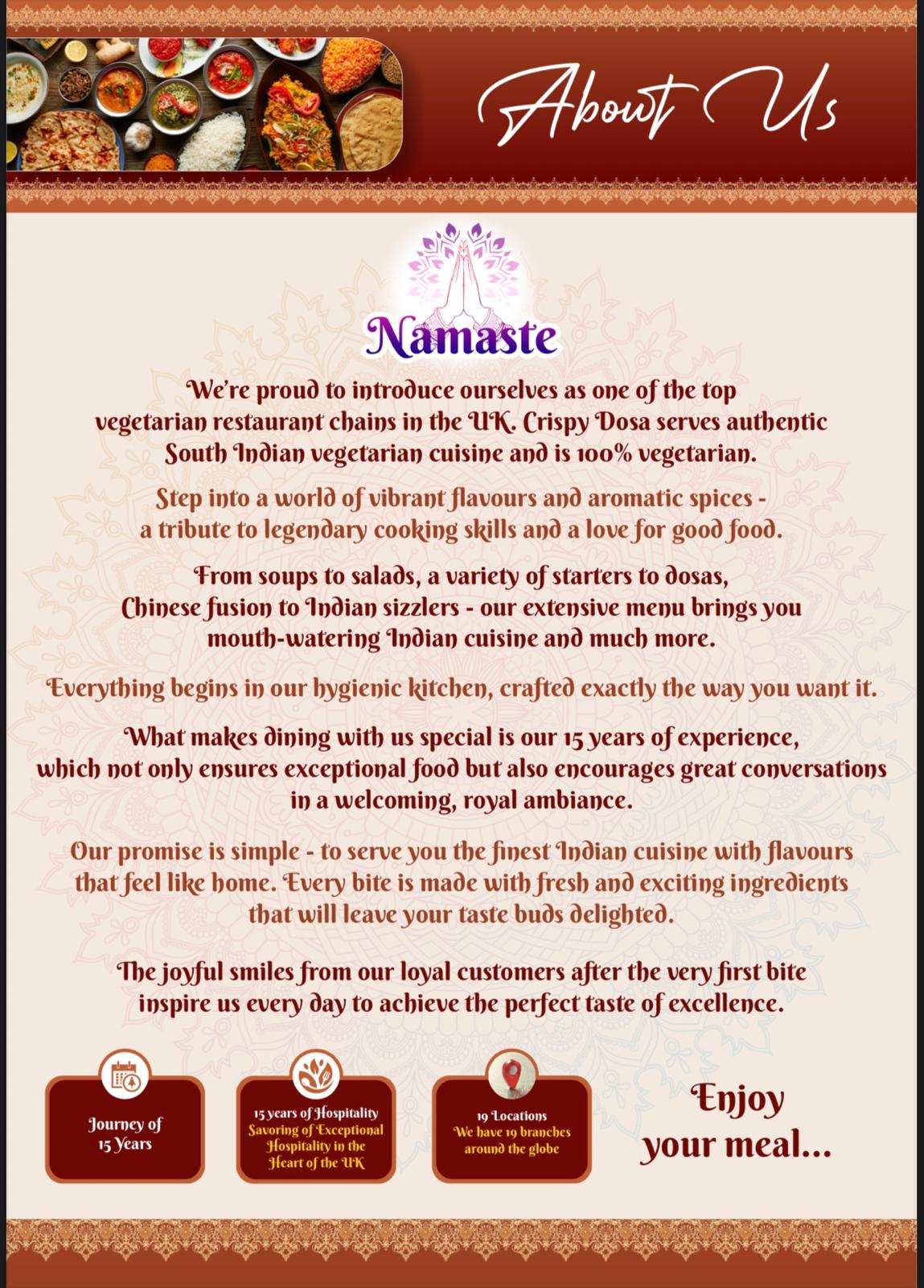 Our dedicated team, comprising skilled chefs from India and local service staff, forms the backbone of Crispy Dosa. They ensure the highest standards of cleanliness, hygiene, and quality, making your dining experience exceptional. Their unwavering commitment drives our continuous improvement and innovation. As our valued guest, you are at the heart of this journey, and we’re here to serve you with excellence and warmth every time you visit.