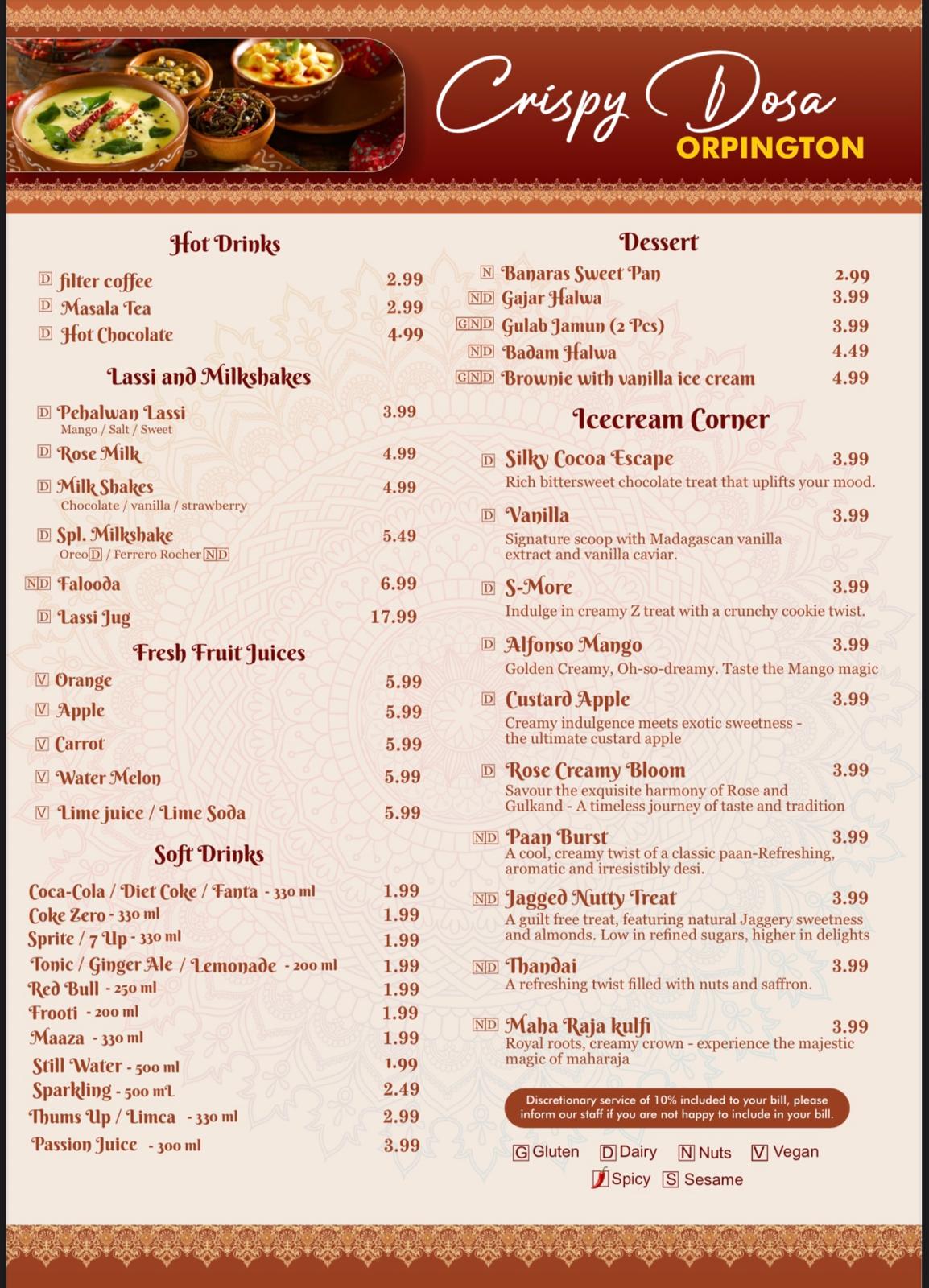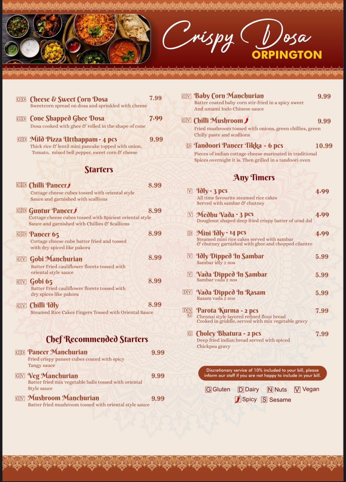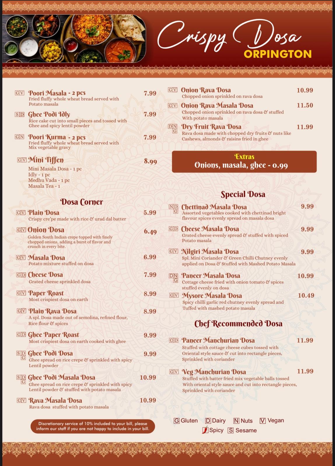 Crispy Dosa in Orpington is a warm and cozy South Indian spot known for authentic flavours, generous servings, and friendly hospitality. With crispy dosas, flavourful chutneys, and special treats like paan ice cream, it delivers a true taste of South India in a comfortable, welcoming setting.